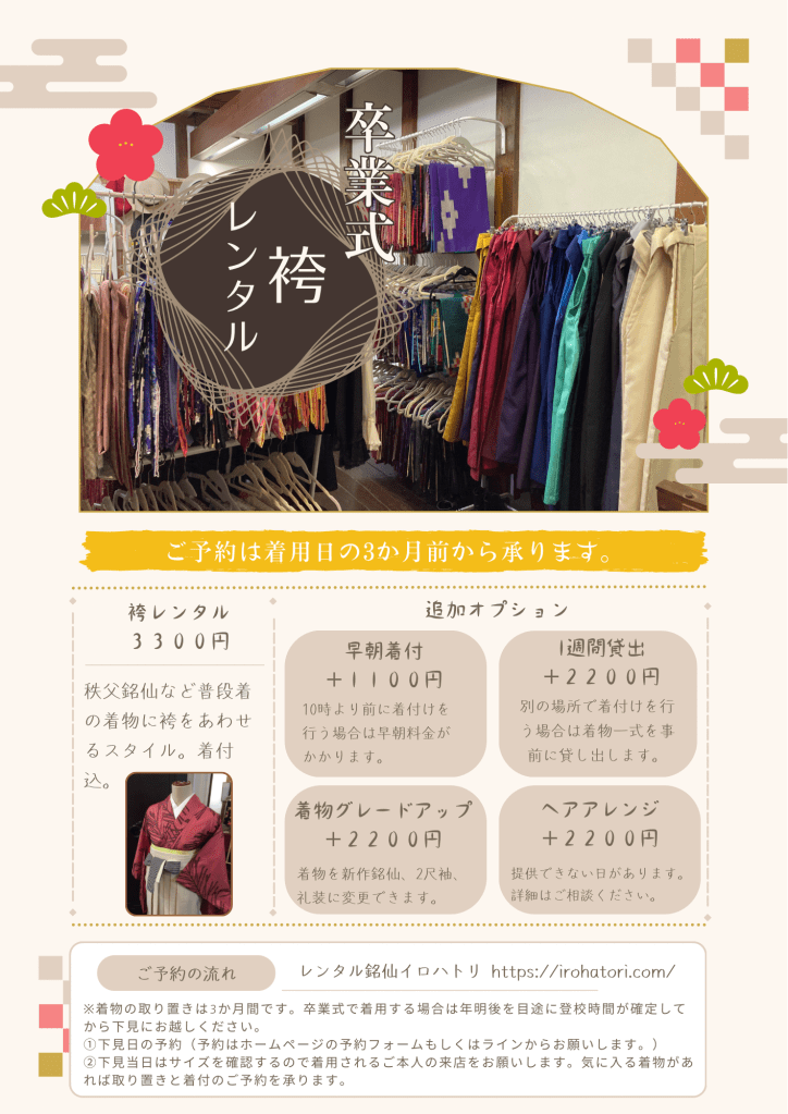 今年はラインナップの見直しを行ったので着物グレードアップ+2200円で新作銘仙、2尺袖、礼装が選べるようになりました。袴をつけるかつけないかは自由に選べるので袴をつけても追加料金はかかりません。